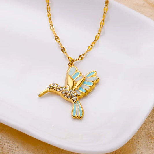 Cute Colorful Birds Necklaces For Women Stainless Steel Gold Color Chain Heart Grass Pendant Necklace Wedding Jewlery Gift New